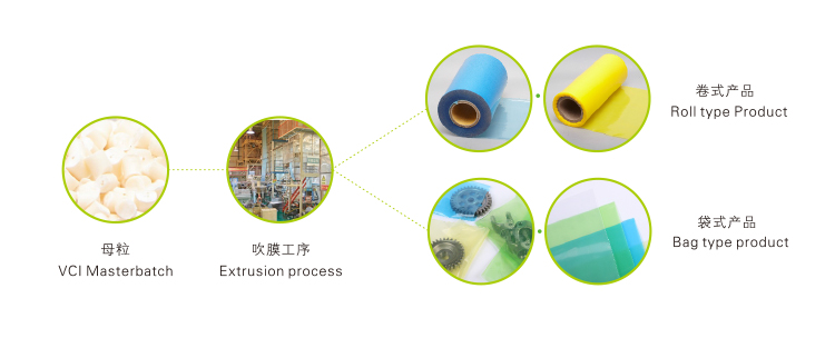 適用于氣相防銹塑料薄膜類產(chǎn)品、氣相防銹熱收縮膜及氣相防銹珍珠棉的擠出吹塑加工,其他防銹塑料類制品的應用需通過工藝確定。